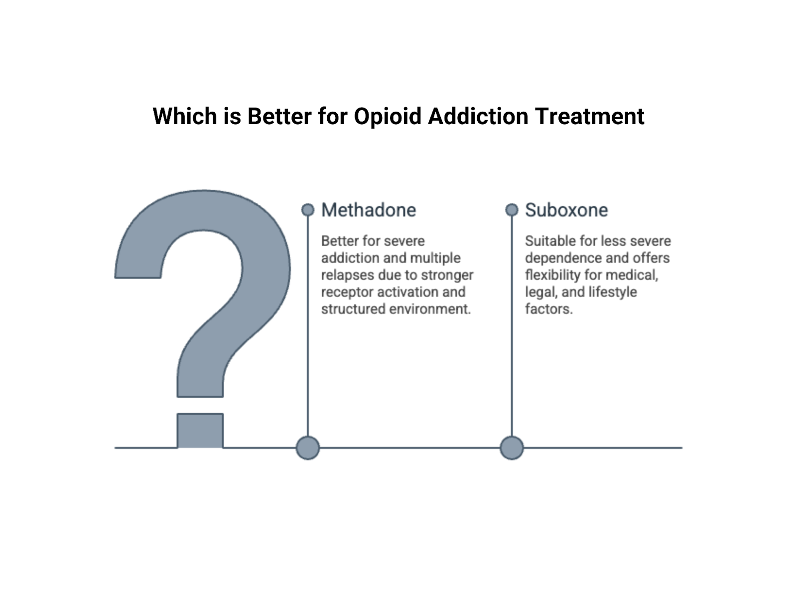 Suboxone and methadone both work. Both save lives and make long term recovery possible. The question is not which medication is universally better, but which one fits your needs. Methadone offers stronger craving suppression and built in structure, though it requires clinic attendance and carries a higher overdose risk. Suboxone offers greater flexibility and a wider safety margin, though it requires more self management and may not control severe cravings as effectively for some individuals.